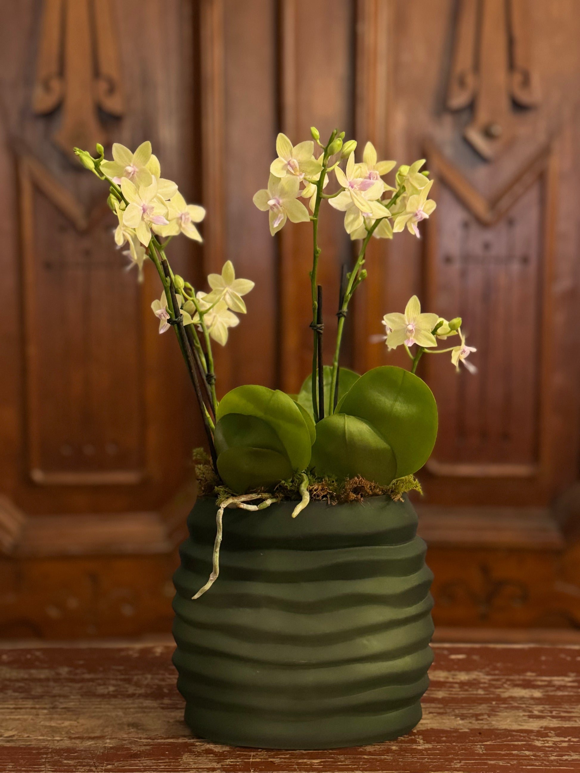 Graceful and understated, Le Jardin Vert Modeste embodies the quiet luxury of European floral design. A lush display of mini orchids finds its home within our Large Oba Wide Greenery Vase — its frosted matte green finish and gentle, sculptural form evoking the charm of a serene garden retreat.