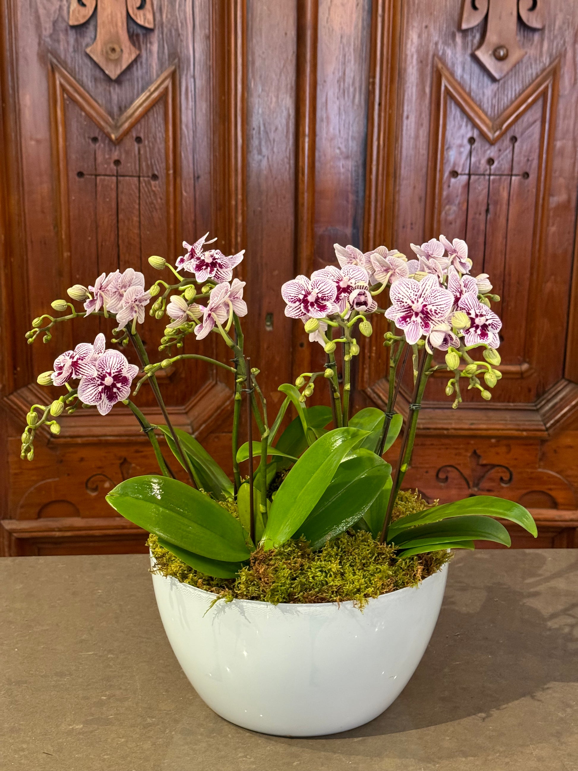 Suzanne Gardner's staff favorites include orchids, which we only use the highest quality of in our planters. Each planter contains five stunning mini orchids, with the color based on available inventory to ensure freshness. Adorn your home or office with our beautiful aged cement pot, filled with lush mood moss and accompanied by detailed care instructions.