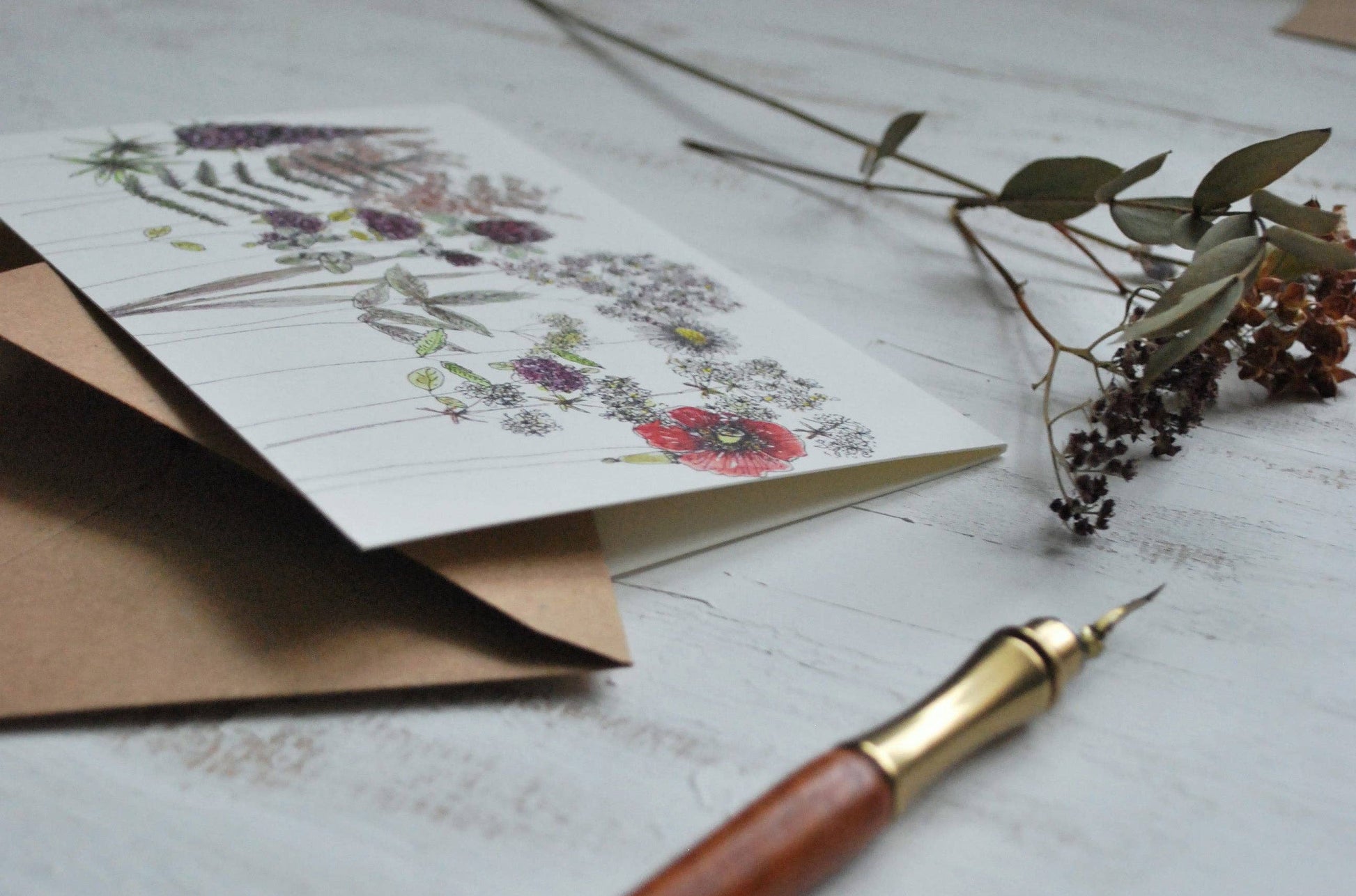 Illustrated Greeting card, folded card with my original watercolor painting print of different meadow, rustic style flowers. SIZE: 4"x 6" (10*15 cm) PAPER: beige 400 gsm weight design paper INK: offset print