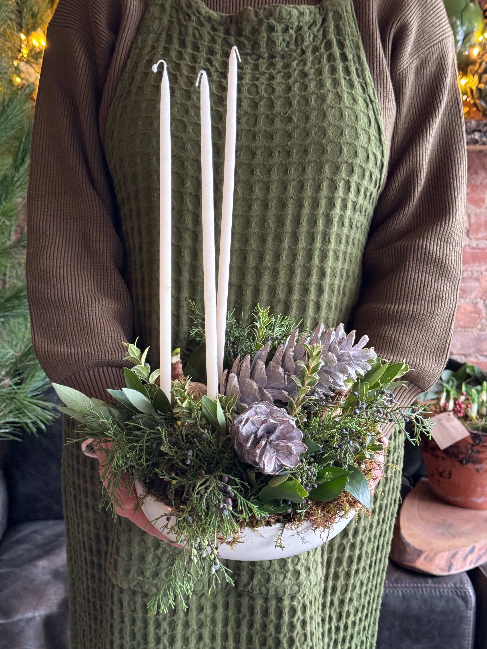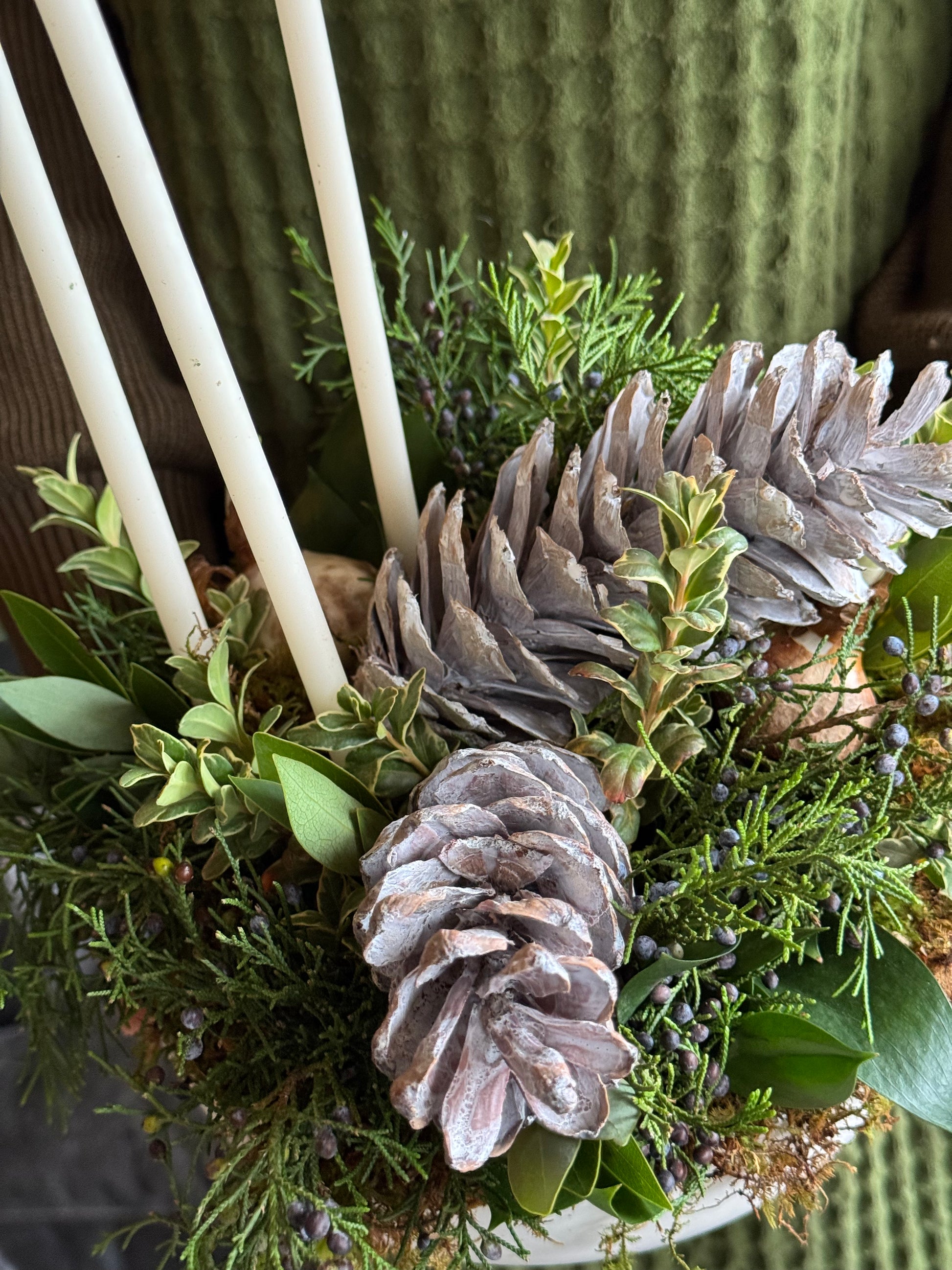 Inspired by the calm light of northern winter evenings, this arrangement pairs slender taper candles with sculptural pine cones gathered from the forest floor. Set among soft winter greens, each element is arranged with simple Scandinavian restraint, allowing the natural textures to shine. When lit, the tall tapers cast a gentle, flickering glow—evoking the quiet magic of the Nordlys, the Nordic night sky.