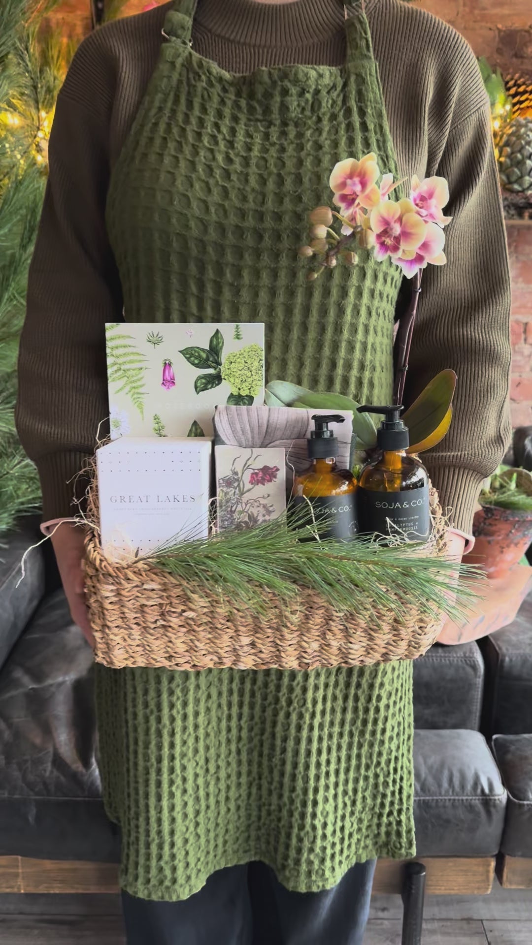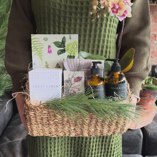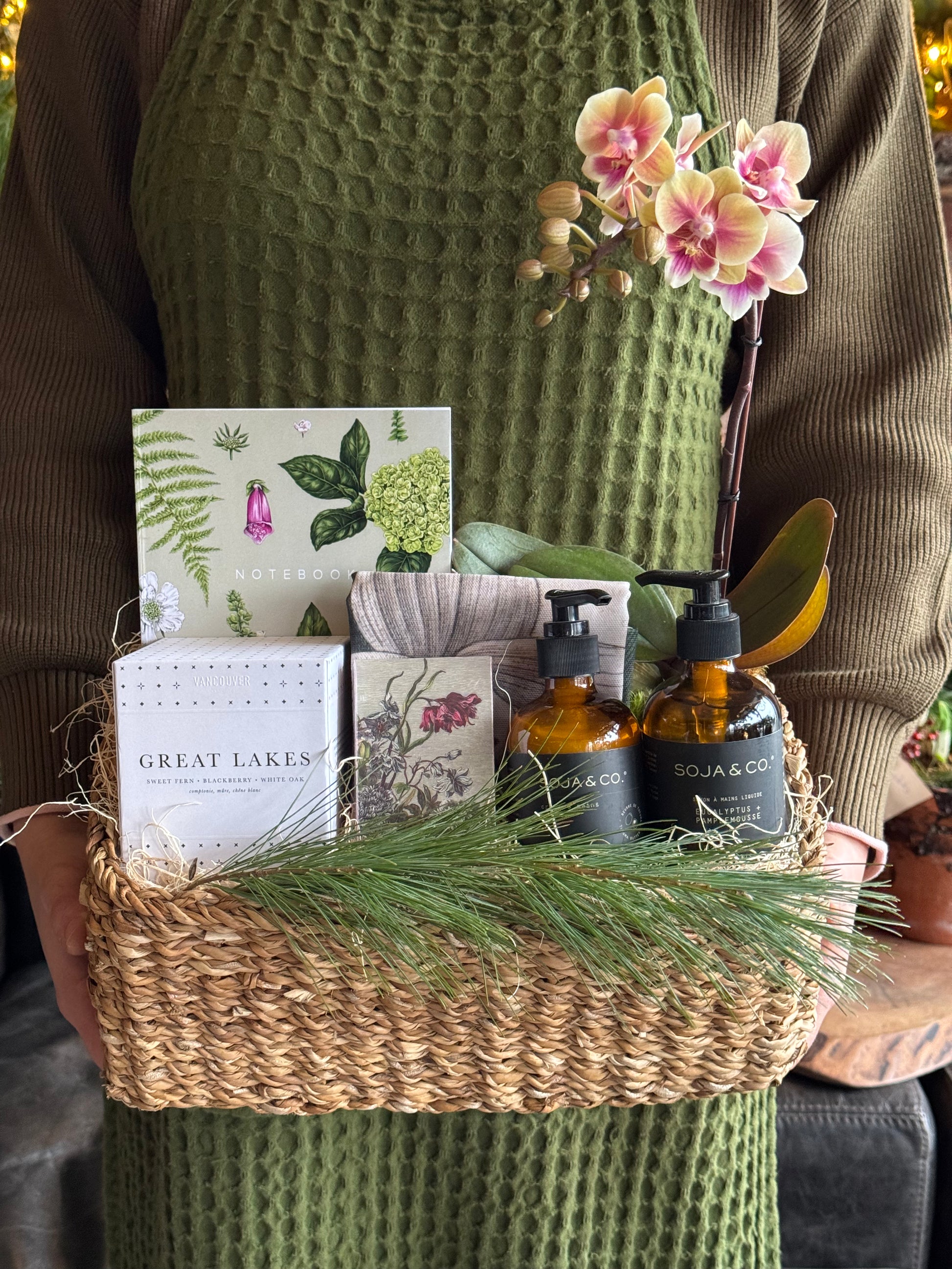 Wrapped in calming winter tones, the Winter Bliss Basket brings together a collection of simple, thoughtful comforts—each chosen to evoke the quiet warmth of a Scandinavian home. Inside, you’ll find a beautifully scented hand soap and lotion from Soja & Co, a soft 100% cotton tea towel, and a clean-burning candle from Vancouver Candle Co that fills the space with gentle, inviting light. A mini potted orchid adds a touch of living elegance, its delicate blooms offering a serene contrast to the season.